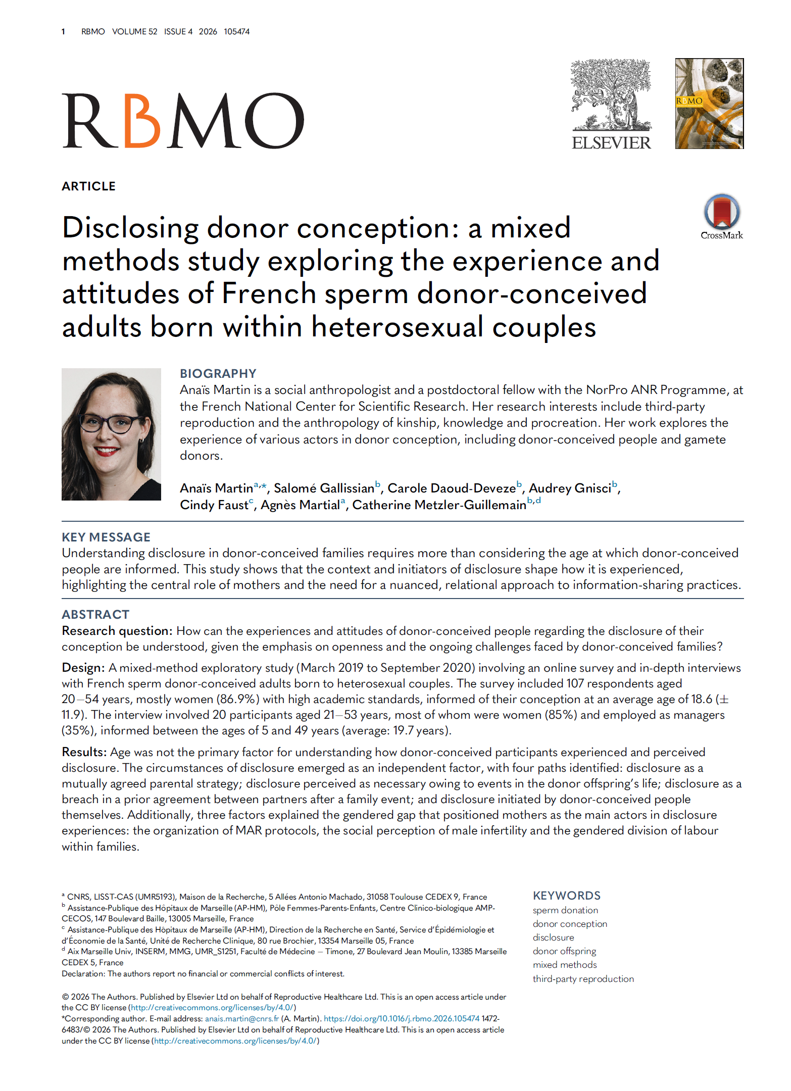 Citation : Anaïs Martin, Salomé Gallissian, Carole Daoud-Deveze, Audrey Gnisci, Cindy Faust, Agnès Martial, Catherine Metzler-Guillemain, Disclosing donor conception: a mixed methods study exploring the experience and attitudes of French sperm donor-conceived adults born within heterosexual couples, Reproductive BioMedicine Online, Volume 52, Issue 4, 2026, 105474, ISSN 1472-6483, https://doi.org/10.1016/j.rbmo.2026.105474. (https://www.sciencedirect.com/science/article/pii/S1472648326000155)